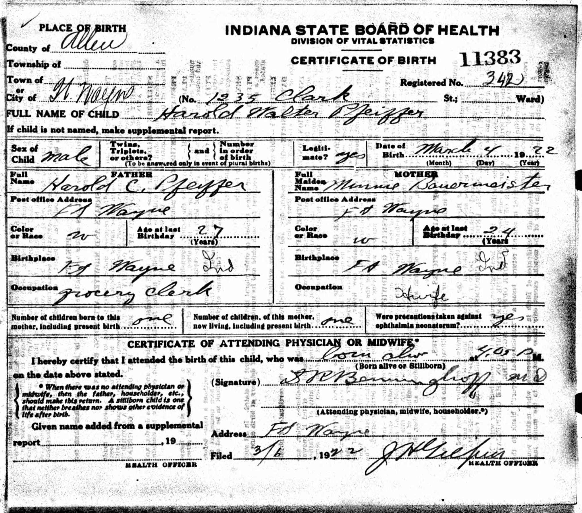 | Born: | March 4, 1922 in Fort Wayne, Allen Co, IN. |
