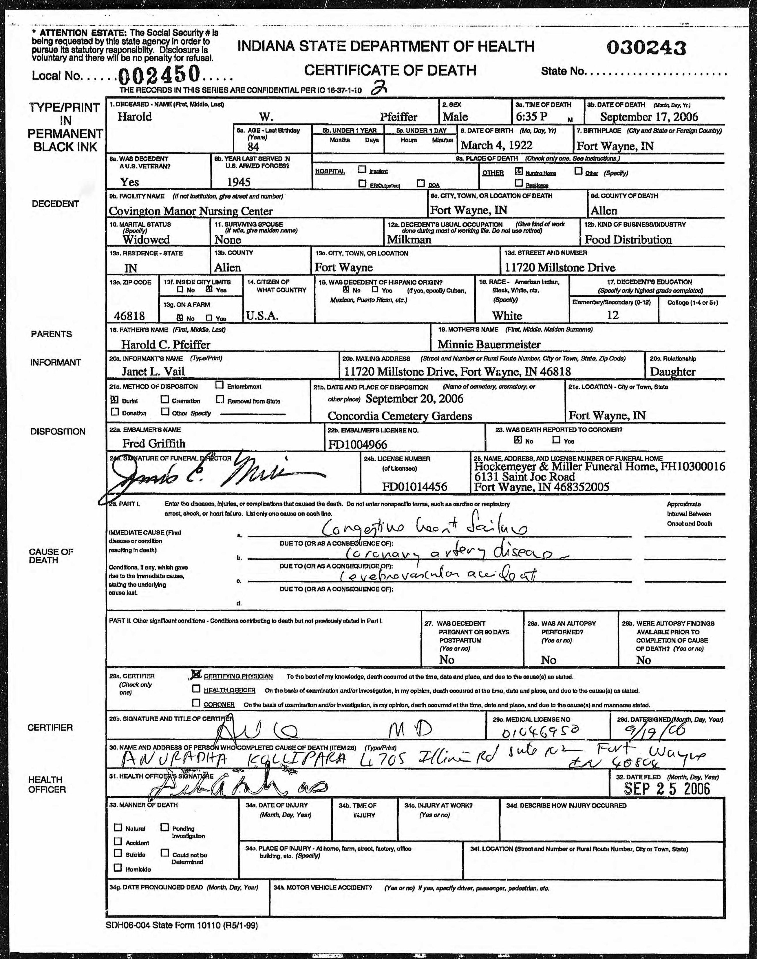 - Death Certificate - Death certificate for Harold