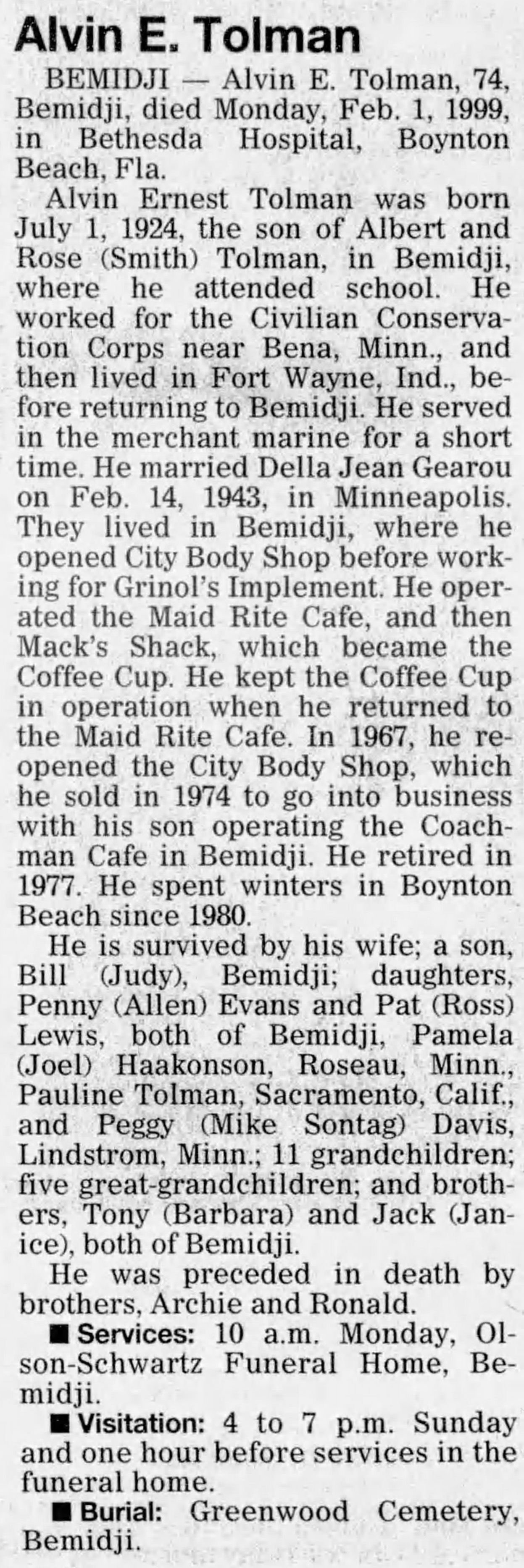 - 1940 Census - Bemidji, Beltrami Co, MN (Listed as Alvin E., age 15, son of Albert E. Tolman)