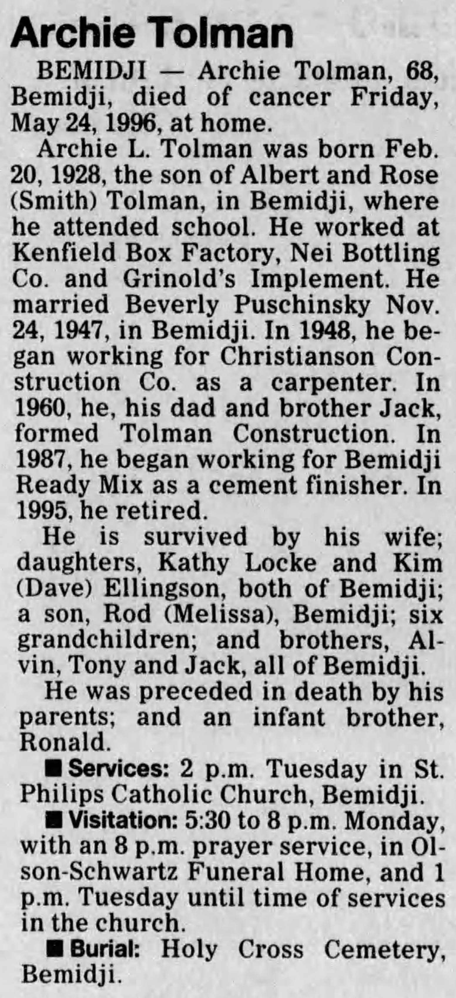 - 1940 Census - Bemidji, Beltrami Co, MN (Listed as Archie L., age 12, son of Albert E. Tolman)