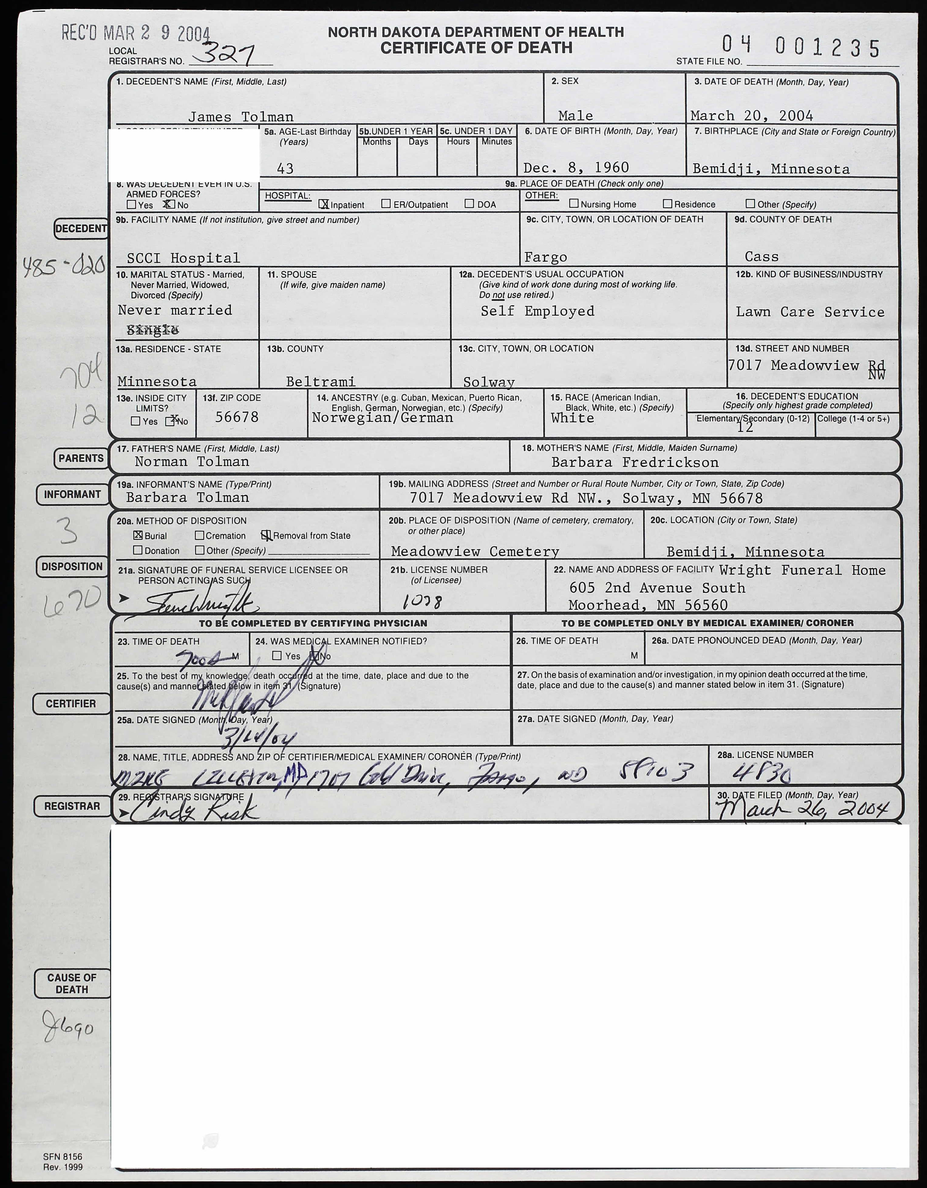 | Died: | March 20, 2004 in Fargo, Cass Co, ND. View Obituary |