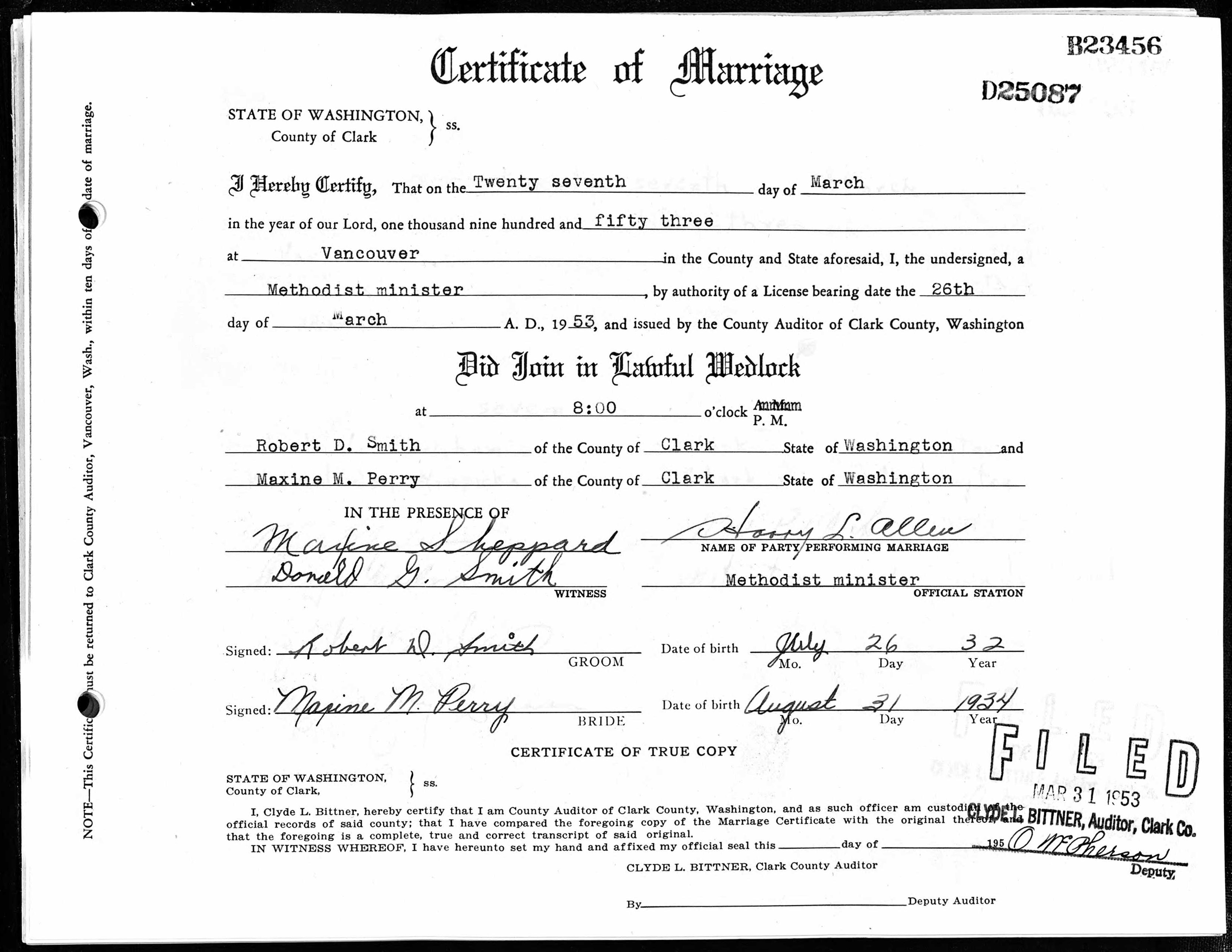 Robert married Maxine M. Perry on March 27, 1953 in Vancouver, Clark Co, WA.