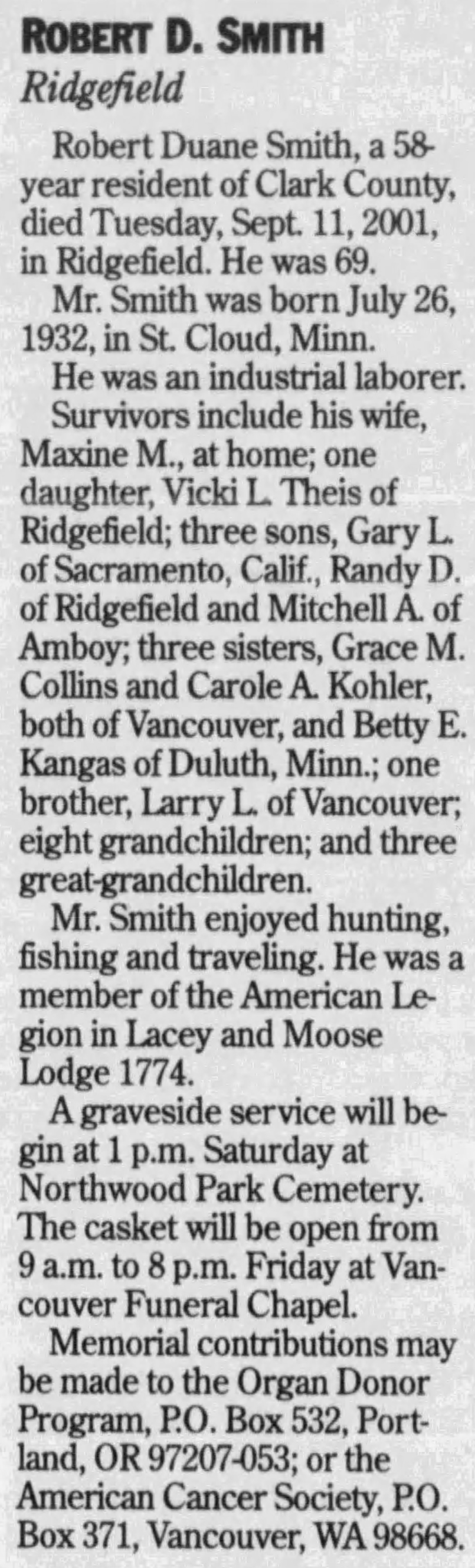 | Died: | September 11, 2001 in Ridgefield, Clark Co, WA. View Obituary |