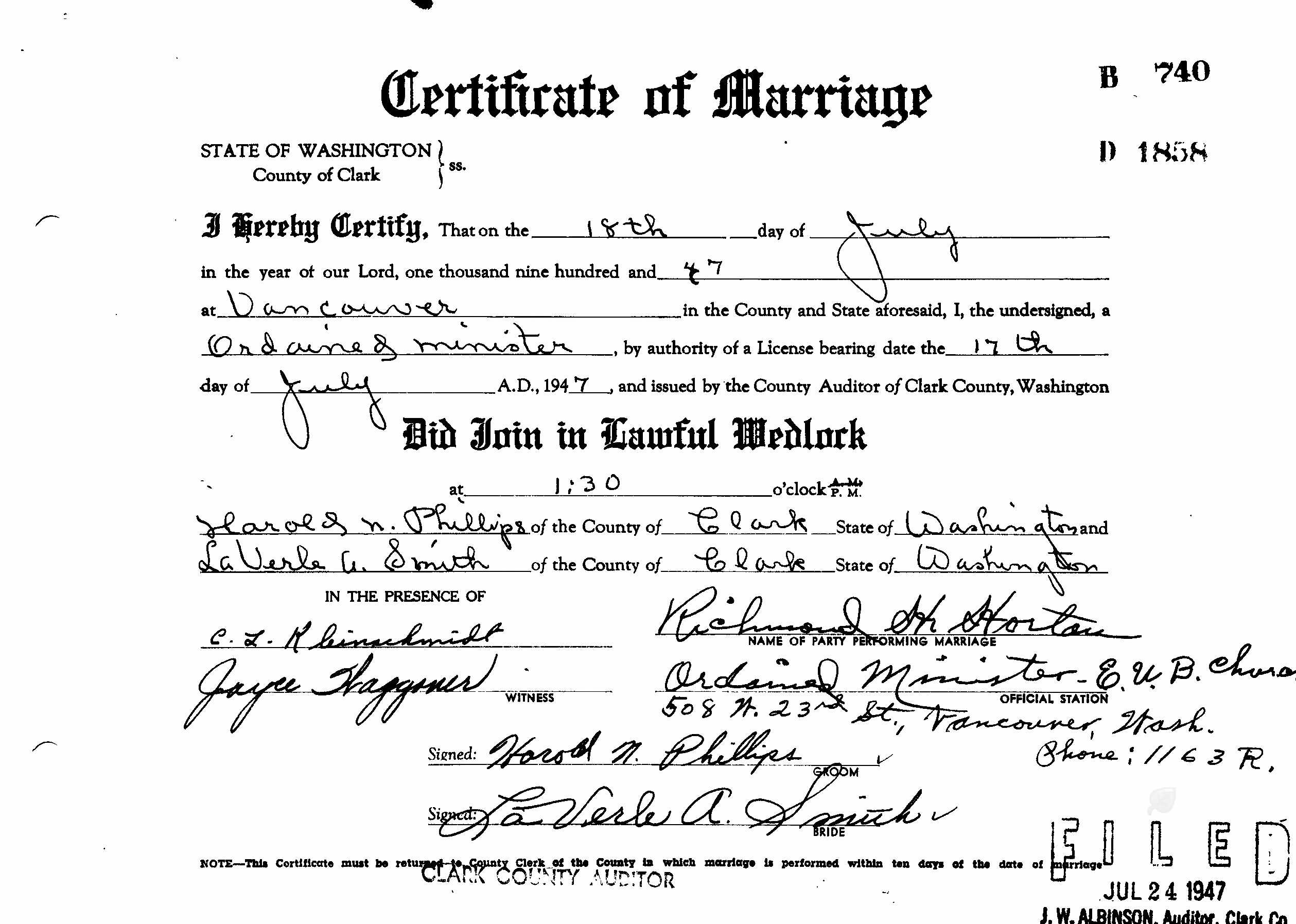 LaVerle married Harold N. Phillips on July 18, 1947 in Vancouver, Clark Co, WA. They later divorced.