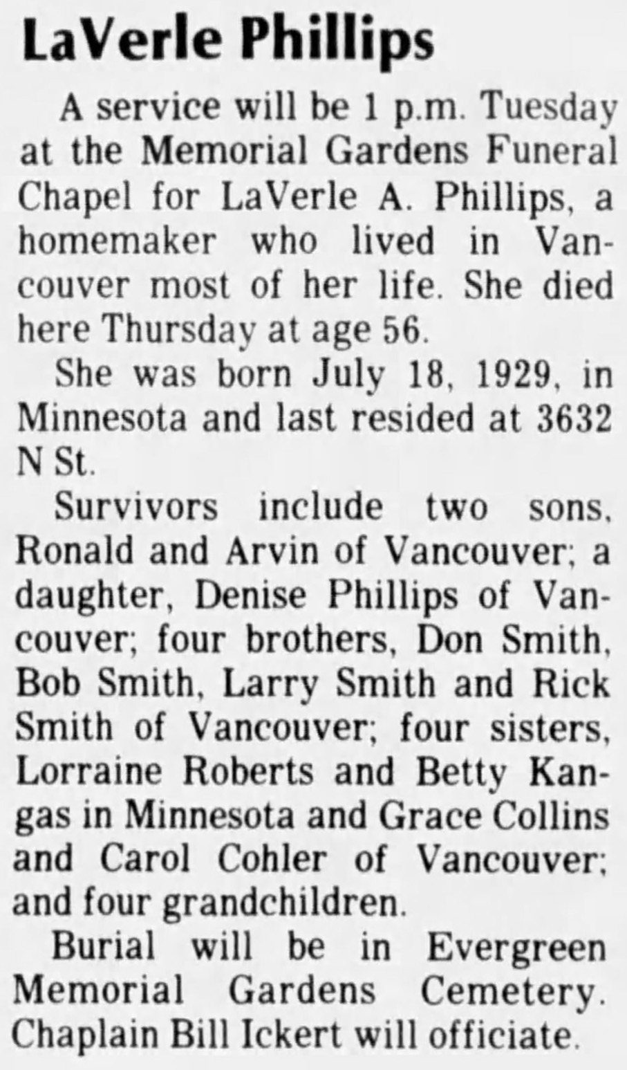 | Buried: | Evergreen Memorial Gardens, Vancouver, Clark Co, WA. |
