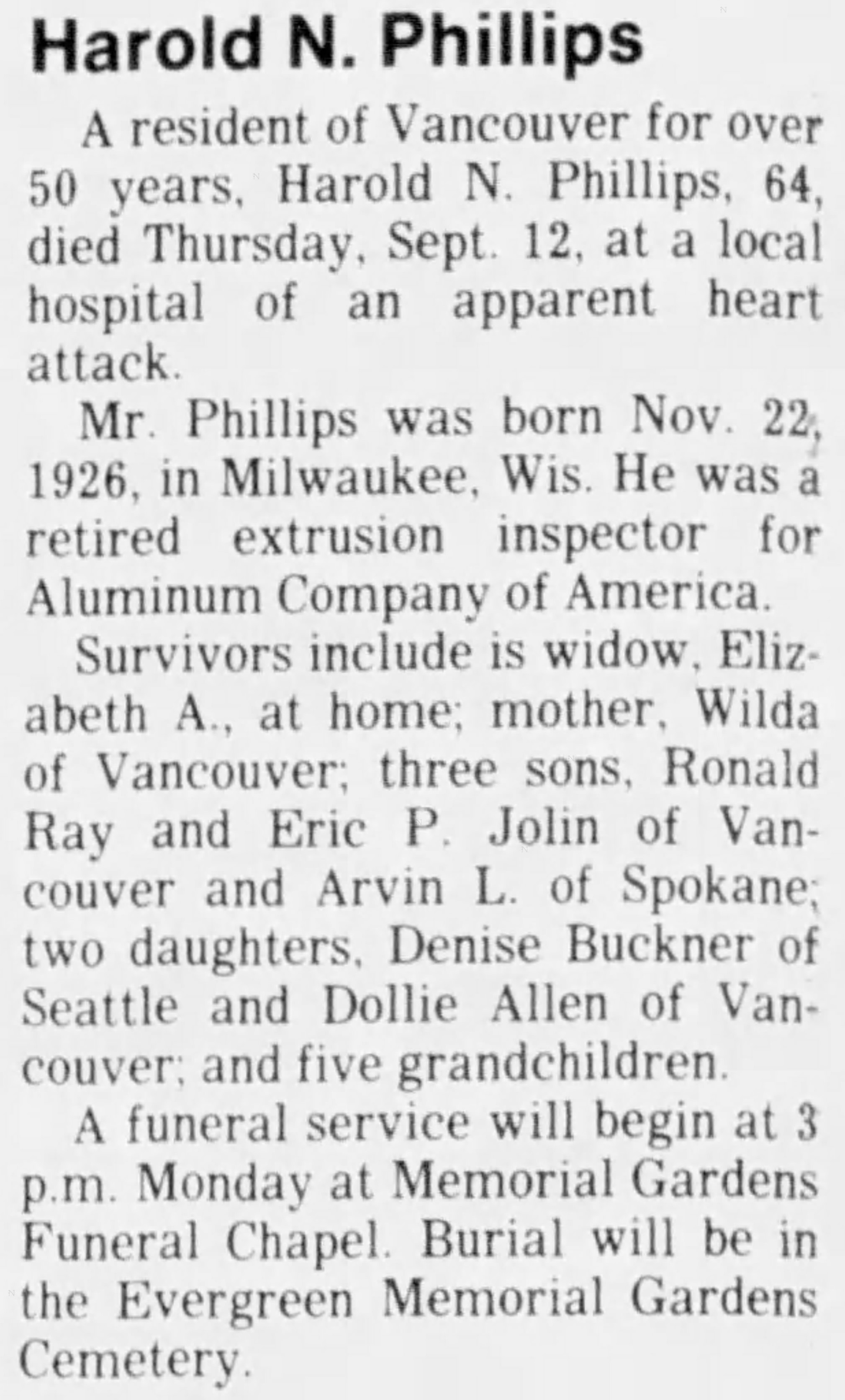 | Died: | September 12, 1991 in Vancouver, Clark Co, WA. View Obituary |