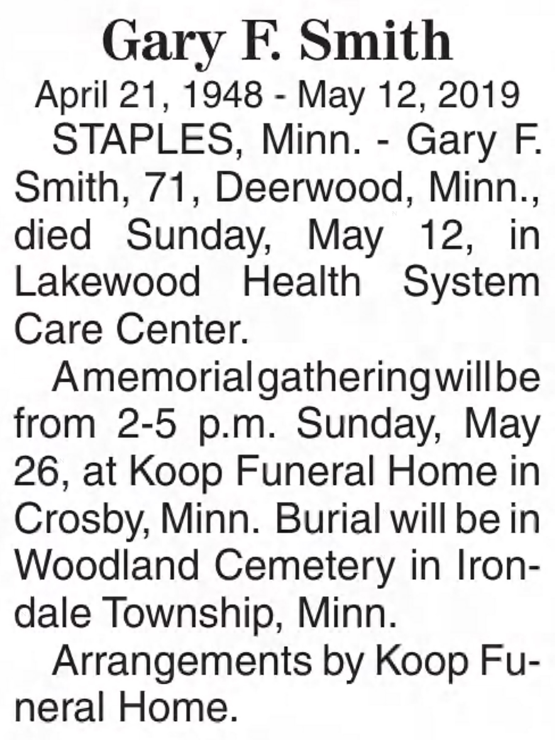 | Died: | May 12, 2019 in Staples, Todd Co, MN. View Obituary |