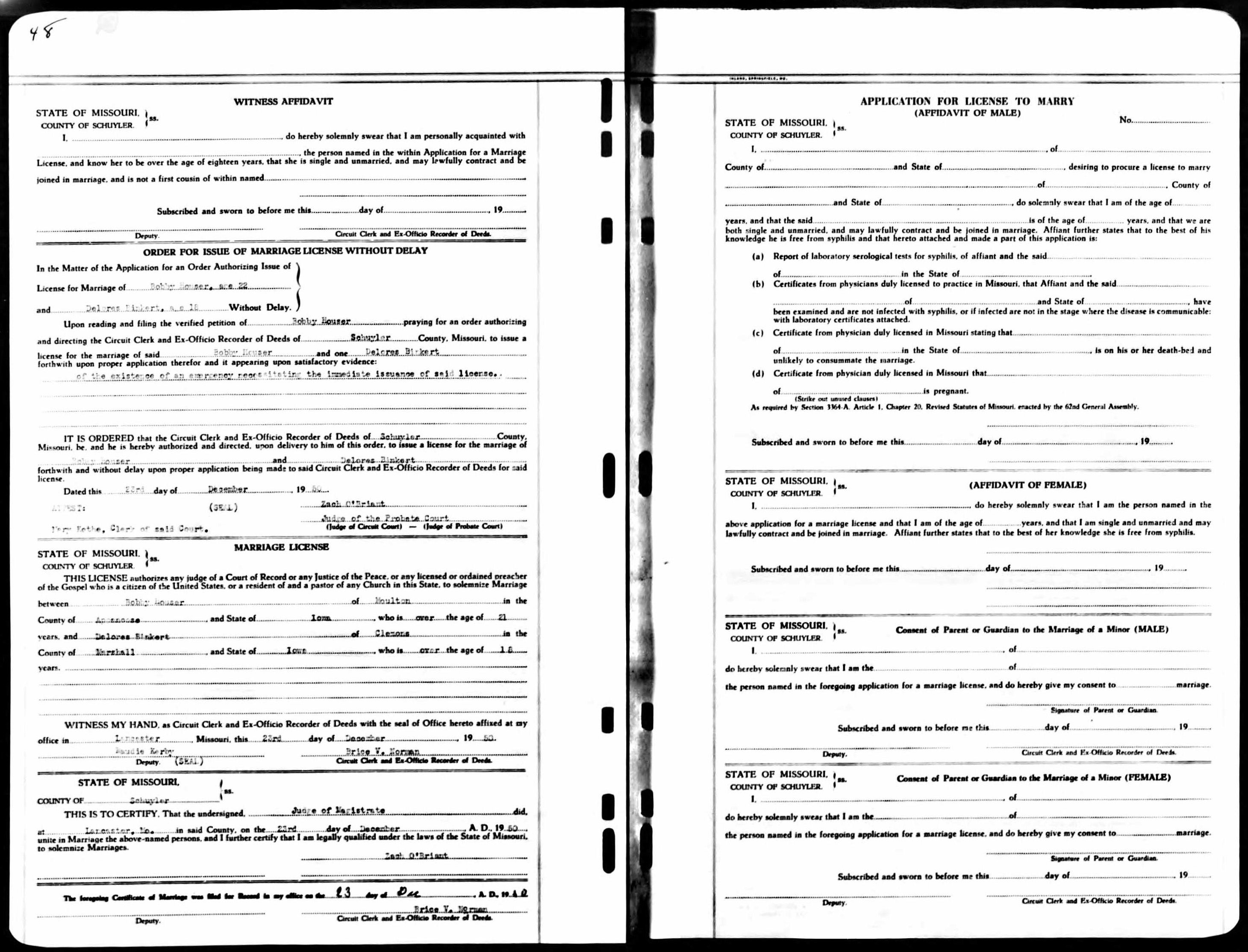 Delores married Bobby Dale Houser on December 23, 1950 in Lancaster, Schulyler Co, MO.