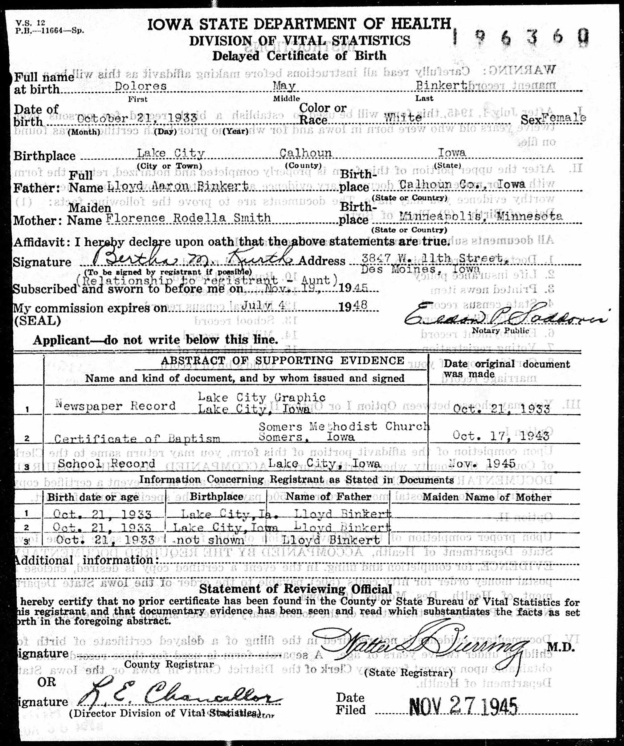 - 1940 Census - Lake City, Calhoun Co, IA (Listed as Delores, age 6, daughter of Lloyd Blinkert)