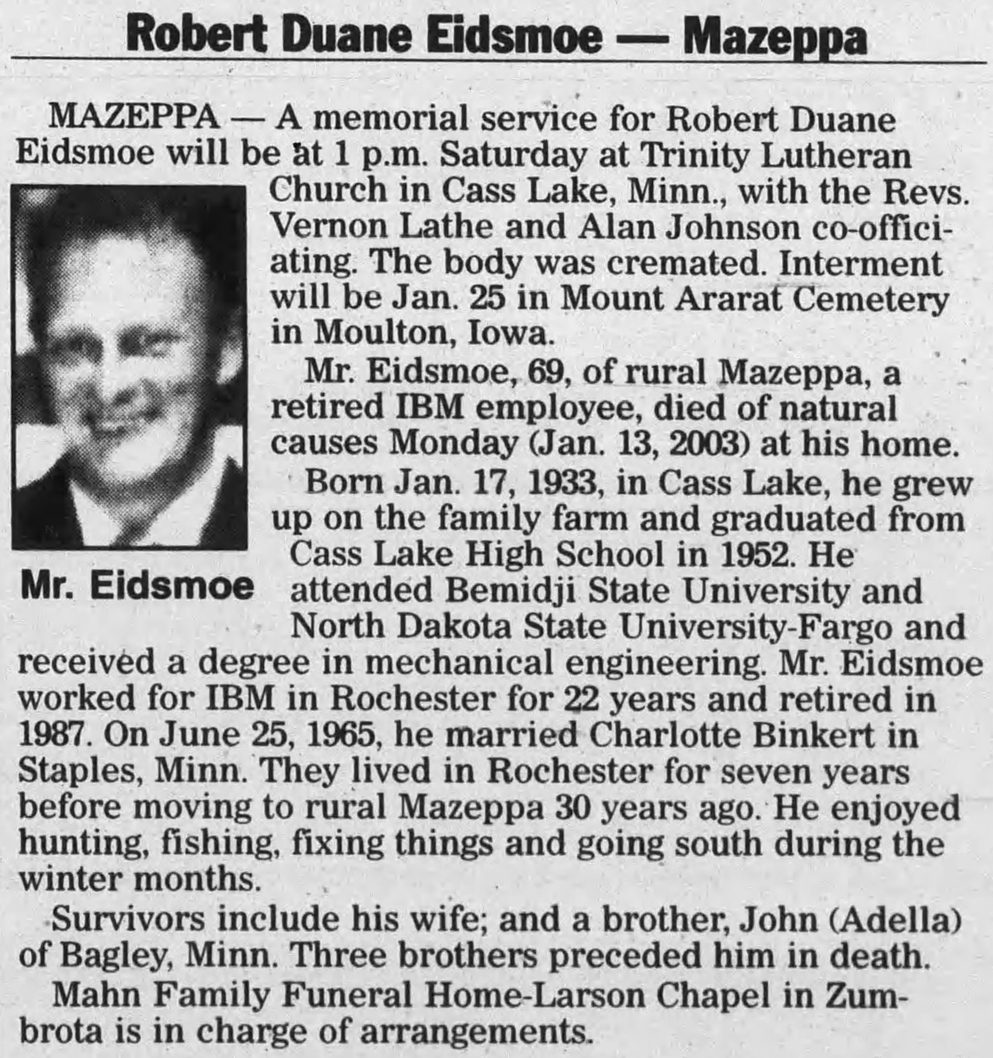 | Died: | January 13, 2003 in Mazeppa, Wabasha Co, MN. View Obituary |