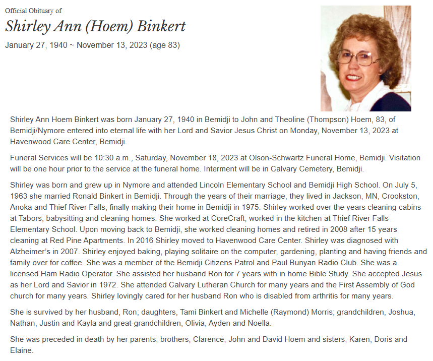 | Died: | November 13, 2023 in Bemidji, Beltrami Co, MN. View Obituary |