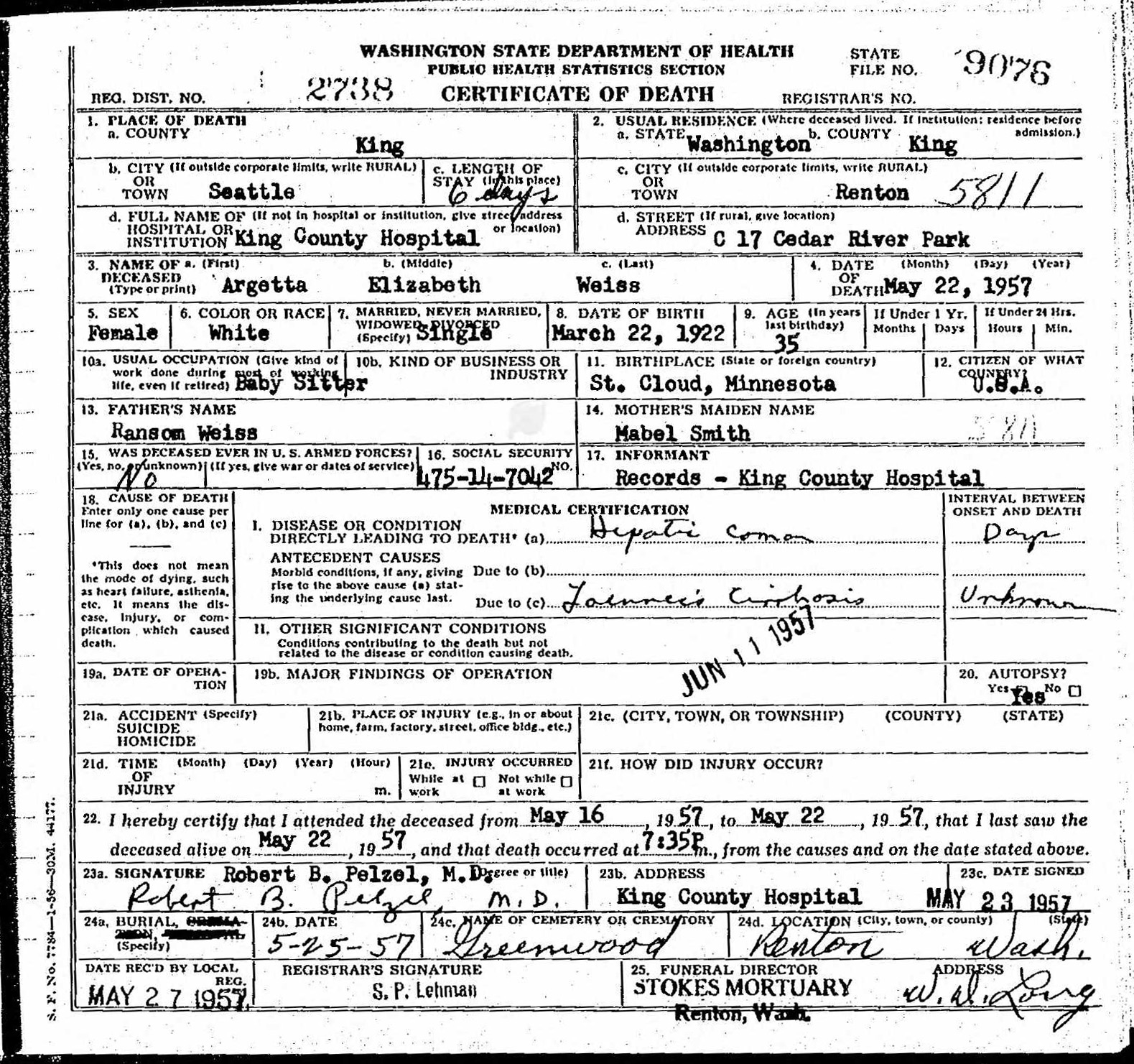 | Died: | May 22, 1957 in Seattle, King Co, WA. |