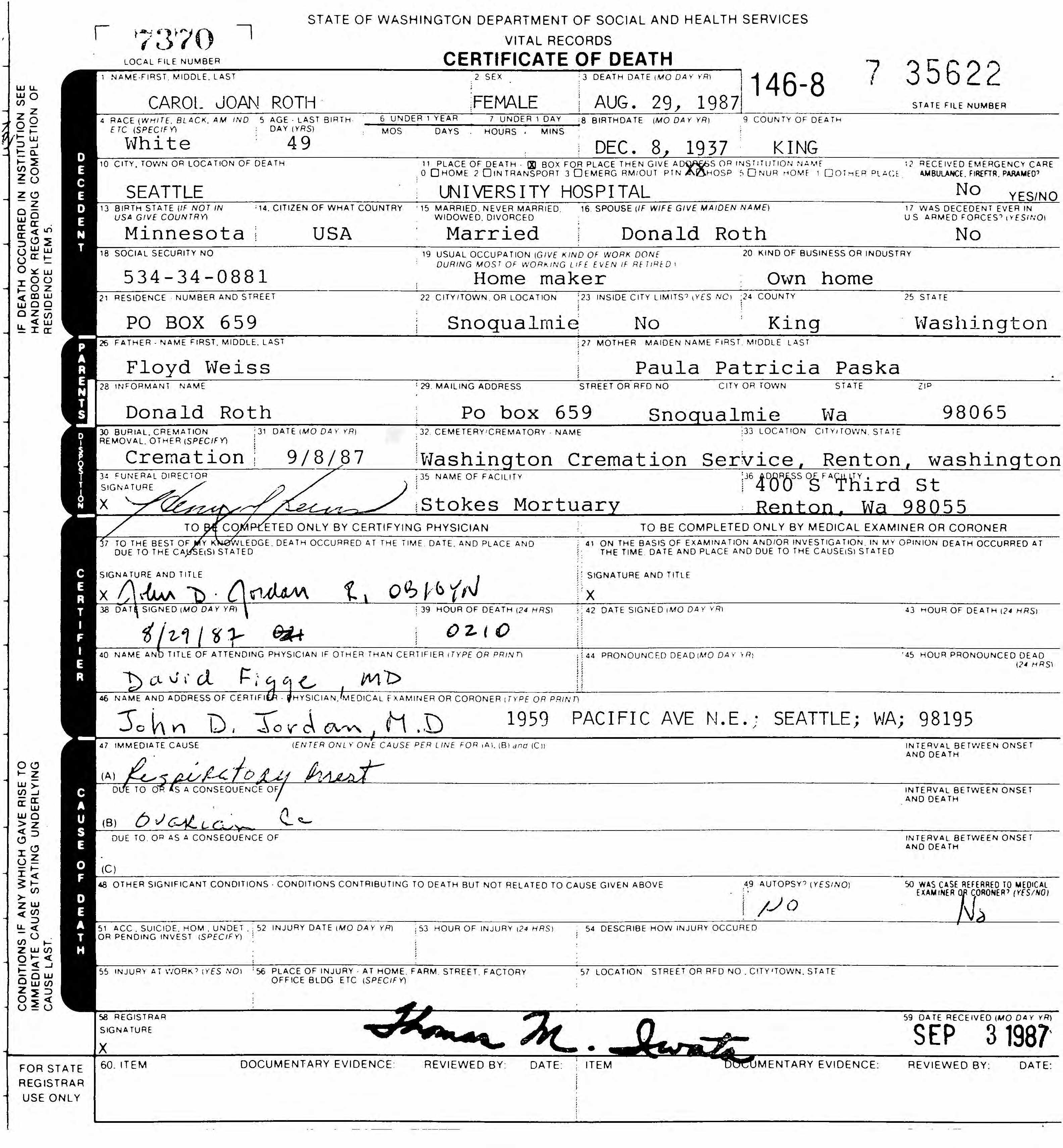 | Died: | August 29, 1987 in Seattle, King Co, WA. |